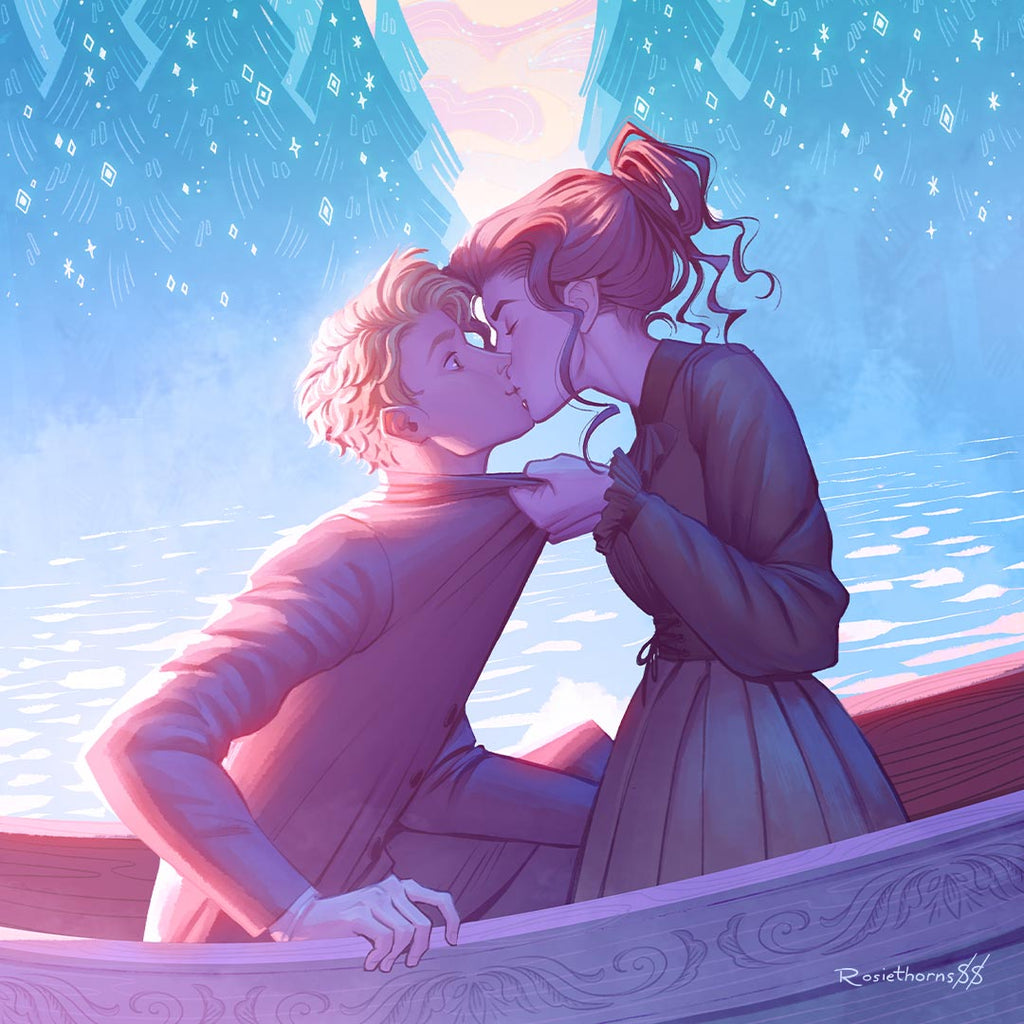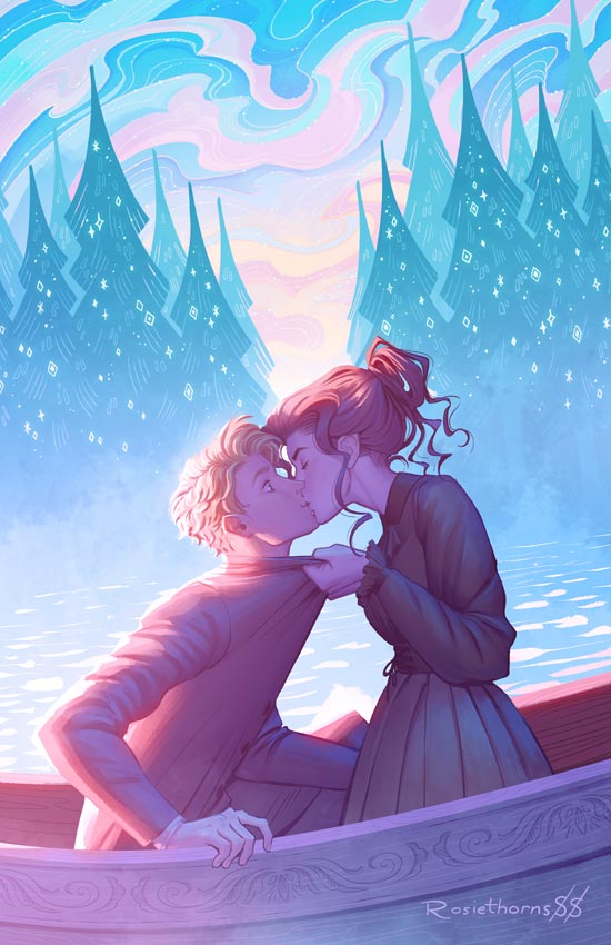 Looking back, I had originally thought this scene took place in the middle of night, but forgot that it was right at sunrise. This immediately changed the color scheme of the piece (some mentioned it looked refreshing!). Coming on the heals of the recent 'Pledge Our Troth' piece I did of Jude and Cardan, how is it that a simple pledge and quick peck is so much more monumental than a multi-month lead up to a wedding?